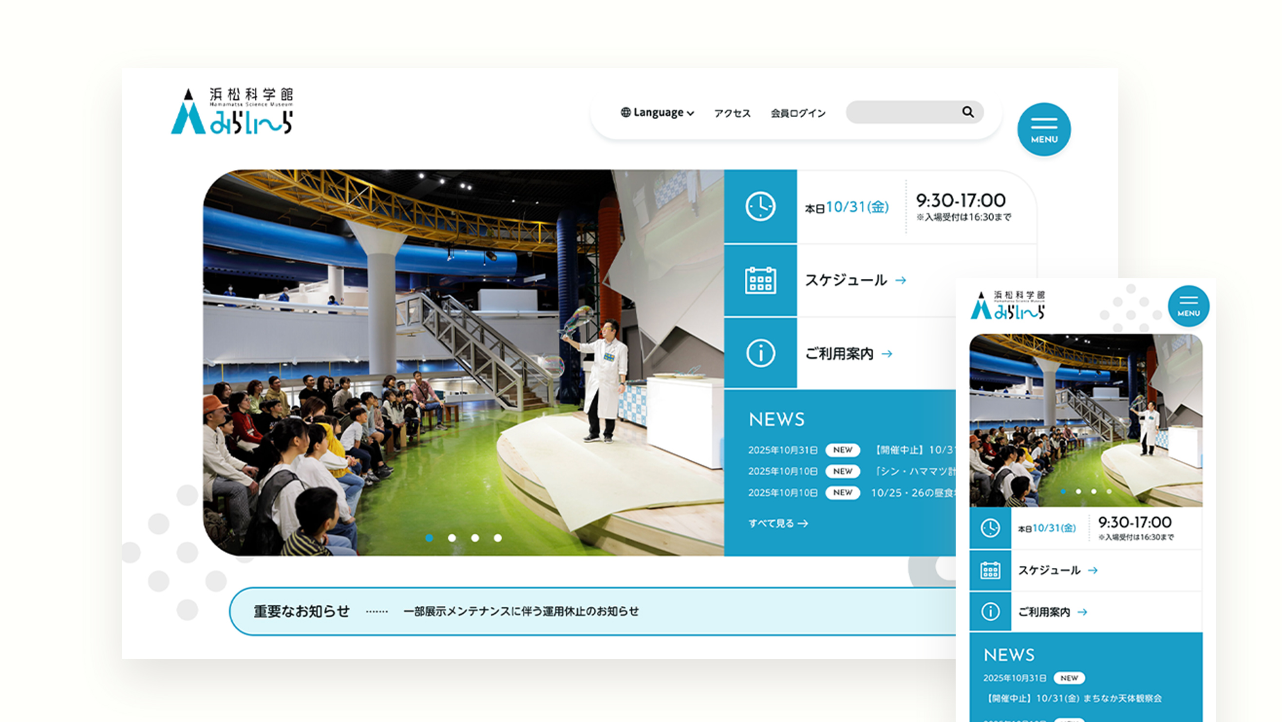 科学館の個性を視覚的にも感じられるデザインとすることで、浜松科学館らしさを体験できるウェブサイトを実現しています。